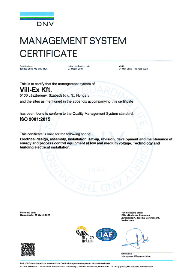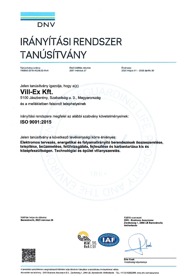 Társaságunk a fentiek teljesülése végett kialakítja és folyamatosan fejleszti az MSZ EN ISO 9001:2015 szabványnak megfelelő minőségirányítási rendszerét.
